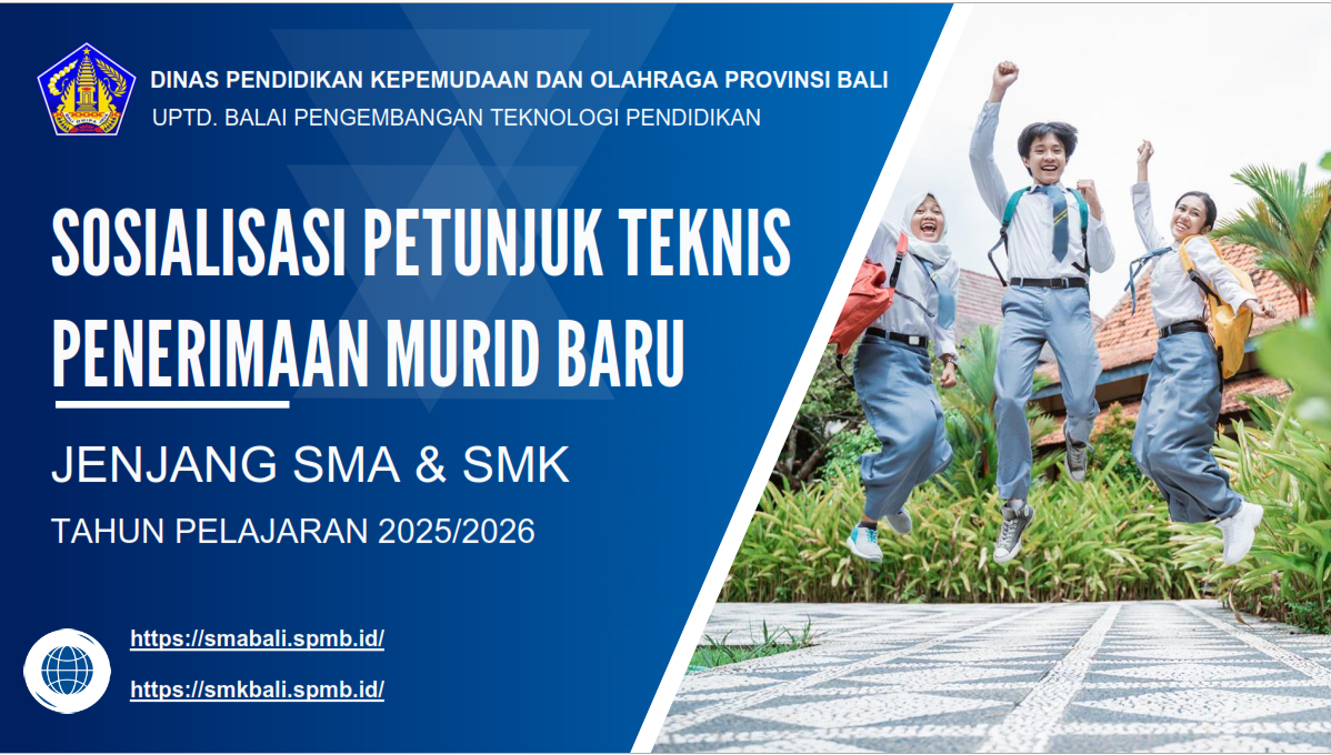 Pada Tahun Pelajaran 2025/2026 SMA Negeri 1 Blahbatuh, Dibawah naungan dinas Pendidikan Pemuda dan Olahraga Provinsi Bali, kembali melaksanakan penerimaan murid baru (SPMB). adapun Petunjuk Teknis dan Kelengkapan nya dapat di unduh pada tautan berikut